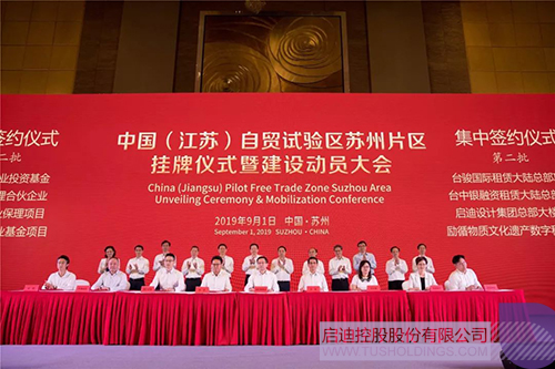 9月1日上午,中國(江蘇)自貿(mào)試驗區(qū)蘇州片區(qū)(以下簡稱“蘇州自貿(mào)區(qū)”)掛牌儀式暨建設(shè)動員大會隆重舉行。江蘇省委常委、蘇州市委書記周乃翔,蘇州市委副書記、市長李亞平為蘇州自貿(mào)區(qū)揭牌。大會現(xiàn)場舉行了包括啟迪設(shè)計集團新總部大樓在內(nèi)的32個自貿(mào)區(qū)項目集中簽約儀式,啟迪設(shè)計集團董事長戴雅萍、總裁查金榮受邀出席掛牌儀式,戴雅萍董事長作為公司代表上臺簽約。