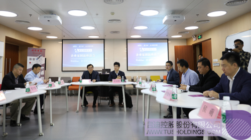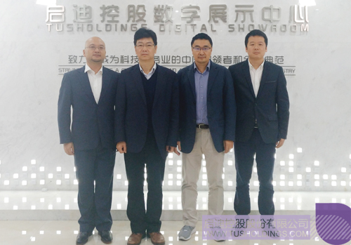 房漢廷副社長(zhǎng)(左二)、劉峰總編輯(右二)座談會(huì)后參觀考察啟迪控股數(shù)字展廳