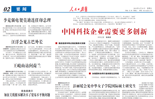 近日,王濟(jì)武董事長(zhǎng)就“華為事件”接受人民日?qǐng)?bào)記者專訪。《人民日?qǐng)?bào)海外版》于今日在要聞版以《中國(guó)科技企業(yè)需要更多創(chuàng)新》為題進(jìn)行了相關(guān)報(bào)道。內(nèi)容如下: