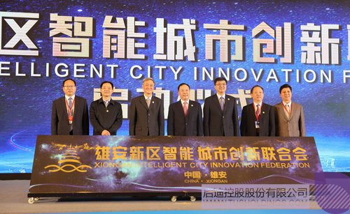 王濟武董事長與全國人大社會建設委員會副主任委員、中國網絡社會組織聯合會會長任賢良,河北省委常委、副省長,雄安新區黨工委書記、雄安新區管委會主任陳剛,中國電子科技集團董事長熊群利,河北省工業和信息化廳廳長、黨組書記龔曉峰,雄安新區黨工委委員、管委會副主任吳海軍,中國信息通信研究院副院長何桂立共同為雄安新區智能城市創新聯合會揭牌
