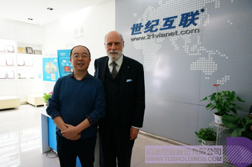 啟迪數(shù)字集團(tuán)聯(lián)席董事長(zhǎng)、世紀(jì)互聯(lián)創(chuàng)始人兼董事長(zhǎng)陳升和溫頓?瑟夫博士(右)合影
